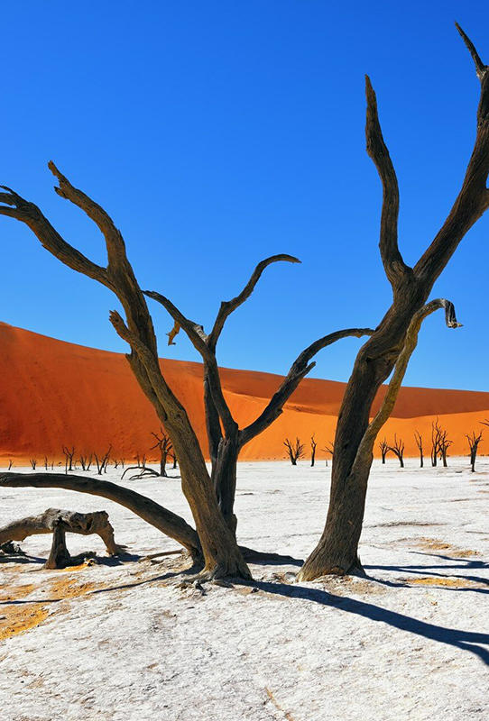 La Namibie impressionne par la diversité de ses panoramas, dominés par les dunes rouges du désert du Namib, parmi les plus hautes du monde, notamment à Sossusvlei et Deadvlei. Ces paysages presque irréels contrastent avec la richesse de la faune que l’on peut observer dans le célèbre Parc national d’Etosha, l’un des plus grands sanctuaires animaliers d’Afrique, où éléphants, lions, girafes et rhinocéros évoluent en liberté.